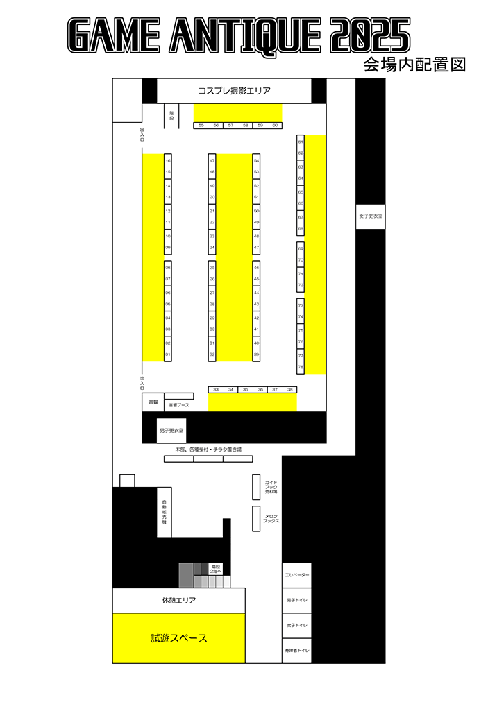 ホームページを更新しました。 ・サークル参加一覧(配置番号付き)に更新しました。 ・サークルカット一覧を更新しました。 ・会場内案内図を更新しました。 ご確認宜しくお願いいたします。 ■サークルリスト(暫定版)を更新しました 2025.10.6記■ 9月30日までに申込頂きましたサークルリストを上げさせて頂きました。 リストに掲載されているサークル様につきましては、申込を受理いたしました。 宜しくお願い致します。 サークル配置は済んでおります。 配置番号付きのサークルリストは後日アップします。 今しばらくお待ち下さい。 抽選もしていないのに当選は違うのではということがあり、少し表記を変更しました。 今回、募集スペースが満了したので、追加募集は行いません。 急な住所変更などのためにフォームは開けております。 宜しくお願い致します。 ■支援印刷所の追加のお知らせ 2025.9.30記■ 支援印刷所に「プリントオン」様を追加致しました。 ![]() 支援印刷所に「大陽出版」様を追加致しました。 ![]() 「すぺしゃるさんくす」の欄に追加しております。 他にも追加して欲しい印刷所がございましたら委員会まで御連絡下さい。 宜しくお願い致します。 ■支援印刷所の追加のお知らせ 2025.9.22記■ 支援印刷所に「ねこのしっぽ」様を追加致しました。 ![]() 「すぺしゃるさんくす」の欄に追加しております。 他にも追加して欲しい印刷所がございましたら委員会まで御連絡下さい。 宜しくお願い致します。 ■支援印刷所の追加のお知らせ 2025.9.20記■ 支援印刷所に「サンライズ」様を追加致しました。 ![]() ![]() 「すぺしゃるさんくす」の欄に追加しております。 他にも追加して欲しい印刷所がございましたら委員会まで御連絡下さい。 宜しくお願い致します。 ■支援印刷所の追加のお知らせ 2025.9.18記■ 支援印刷所に「ブロス」様を追加致しました。 ![]() 支援印刷所に「オレンジ工房.com」様を追加致しました。 ![]() 「すぺしゃるさんくす」の欄に追加しております。 他にも追加して欲しい印刷所がございましたら委員会まで御連絡下さい。 宜しくお願い致します。 ■支援印刷所の追加のお知らせ 2025.9.17記■ 支援印刷所に「STARBOOKS」様を追加致しました。 ![]() 支援印刷所に「丸正インキ」様を追加致しました。 ![]() 支援印刷所に「関西美術印刷」様を追加致しました。 ![]() 支援印刷所に「くりえい社」様を追加致しました。 ![]() 支援印刷所に「K9」様を追加致しました。 ![]() 「すぺしゃるさんくす」の欄に追加しております。 他にも追加して欲しい印刷所がございましたら委員会まで御連絡下さい。 宜しくお願い致します。 ■支援印刷所の追加のお知らせ 2025.9.16記■ 支援印刷所に「栄光」様を追加致しました。 ![]() 支援印刷所に「ホープツーワン」様を追加致しました。 ![]() 「すぺしゃるさんくす」の欄に追加しております。 他にも追加して欲しい印刷所がございましたら委員会まで御連絡下さい。 宜しくお願い致します。 ■サークルリスト(暫定版)を更新しました 2025.9.2記■ 9月1日までに申込頂きましたサークルリストを上げさせて頂きました。 リストに掲載されているサークル様につきましては、全て当選とさせて頂きます。 宜しくお願い致します。 配置番号付きのサークルリストは後日アップします。 今しばらくお待ち下さい。 ■サークル参加直接受付のお知らせ 2025.6.7記■ 下記のイベントで直接受付の予定です。 2025年8月16日(土)、東京ビッグサイトにて開催される 「コミックマーケット106」にて、 サークル参加の直接受付をこっそり行う予定です。 サークルSP「土曜日 東B41a」 サークル名「よんこま小町開催委員会」になります。 宜しくお願い致します。 ■次回開催について 2025.4.4記■ 少し早いですが、次回開催(来年)について告知致します。 「GAME ANTIQUE 2026」は2026年6月28日(日)、此花会館にて開催します。 宜しくお願い致します。 ■GAME ANTIQUE 2025 サイト運営開始 2025.3.22記■ ホームページを2025年のバージョンに変更しました。 デバッグは致しましたが、更新されていない箇所、リンクミス等があるかもしれません。 そこはご教示頂けましたら幸いです。適宜修正致します。 GA2025のガイドブックに関わるイラスト(表紙、注意書き漫画)作家様 を募集しております。詳細はお問い合わせ下さい。 ■新年のご挨拶 2025.1.1記■ 旧年中はお世話になりました。 本年度も中の人・スタッフ一同奮起してまいりますので、宜しくお願い致します。 過去、申込をされたサークルの皆様に、メールにてDMをお送りさせて頂きました。 ご確認頂けましたら幸いです。 今年から封書の送付は、諸般の事情により無しとなります。すみません。 開催継続のため、皆様のご支援・ご来場、宜しくお願い申し上げます。 ホームページの更新は、諸般の事情により、3月中旬の予定です。 例年より更新が遅くなってしまいますが、お待ち頂けましたら幸いです。 ■チラシの誤植について 2024.12.15記■ 来年分